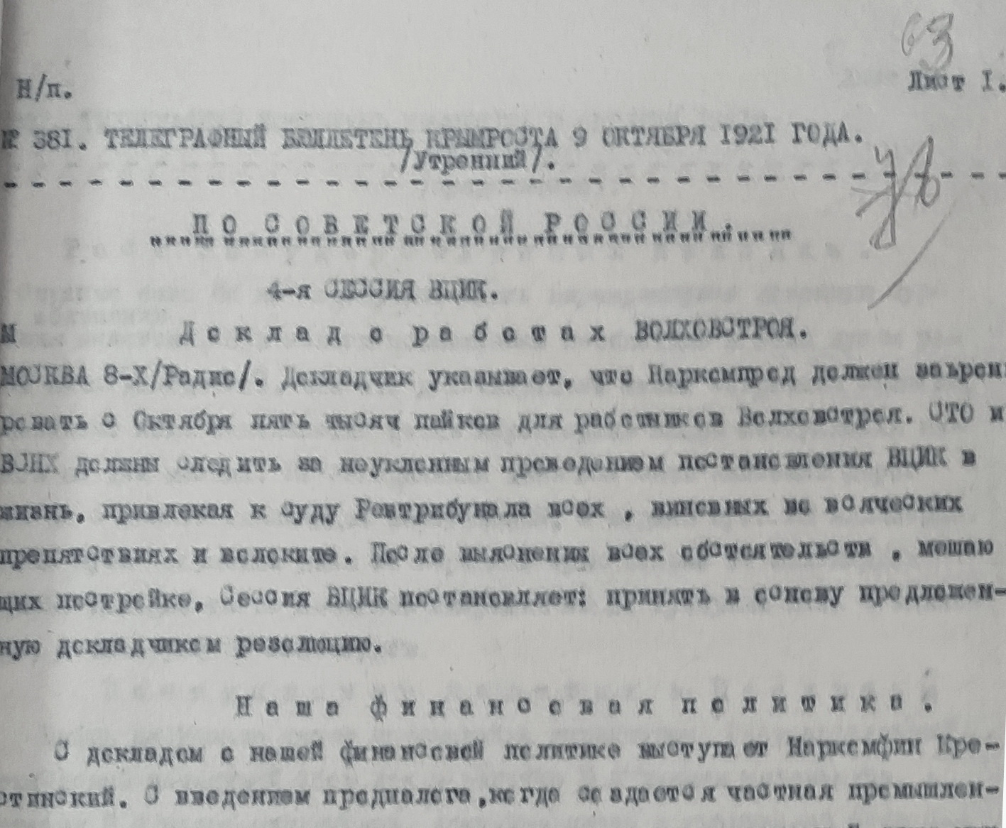 Рис. 1. Телеграфный бюллетень КрымРОСТА (утренний) от 9 октября 1921.