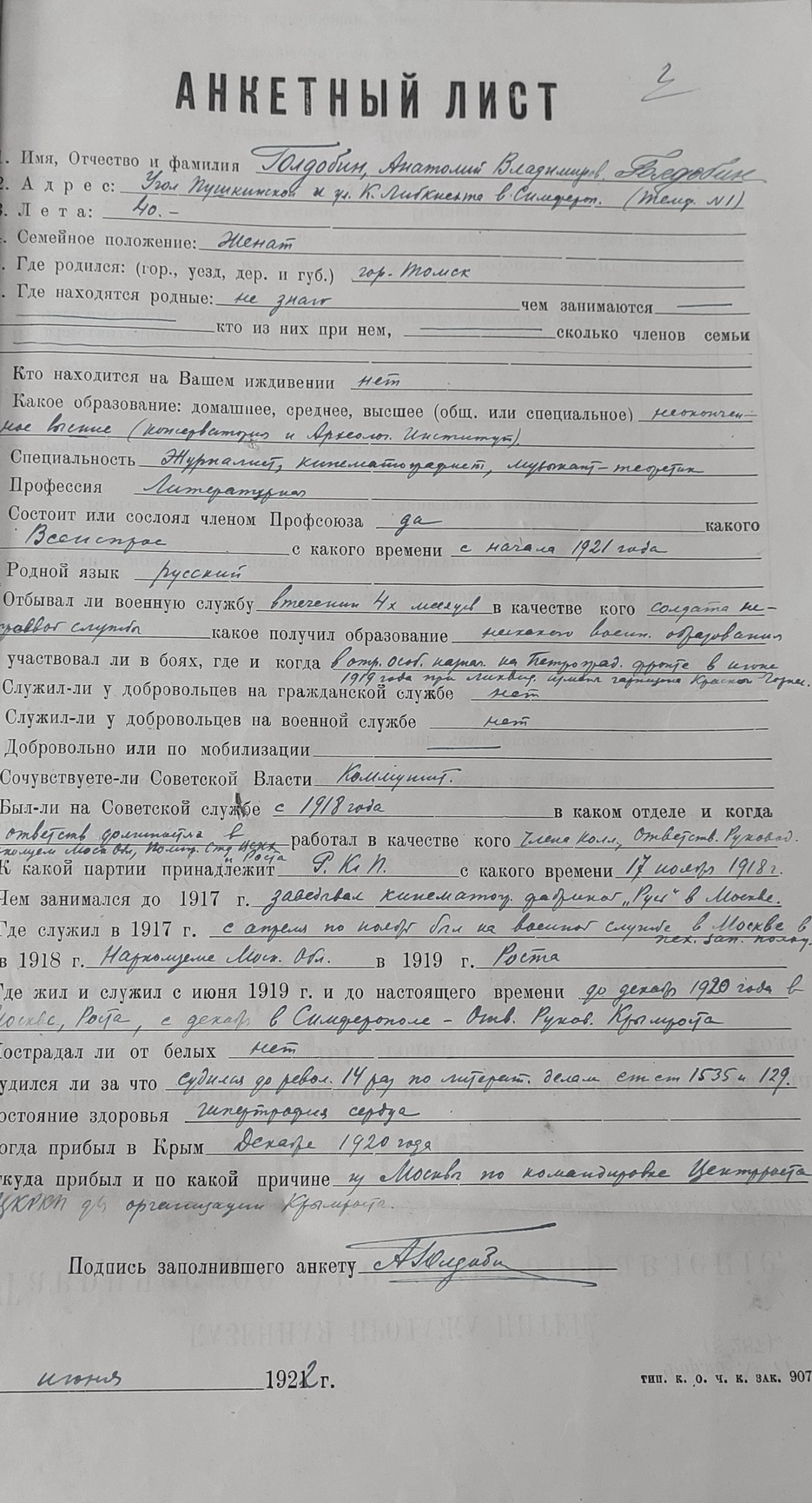Рис. 2. Анкетный лист, заполненный А. В. Голдобиным собственноручно [11].