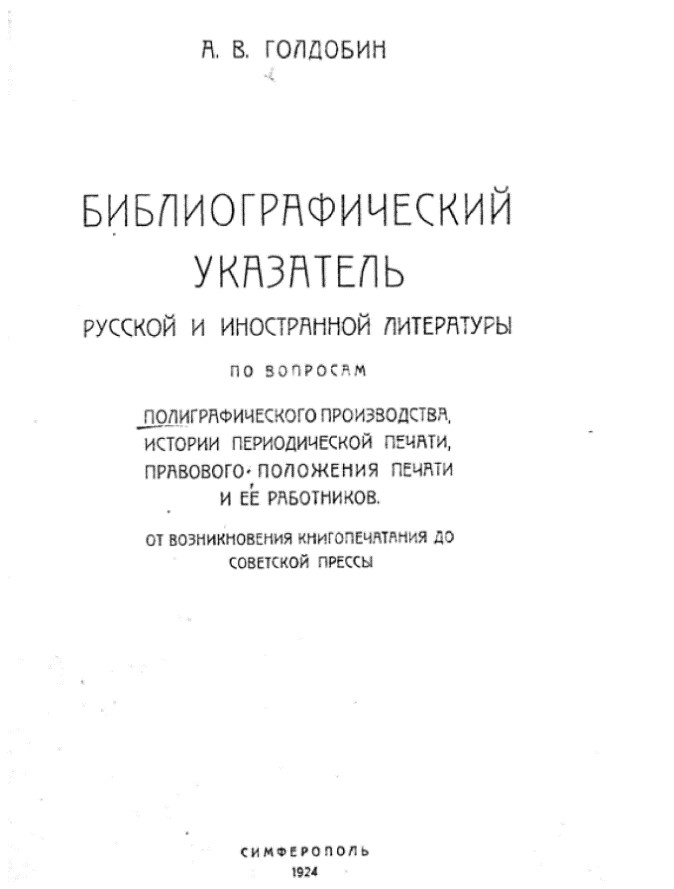 - Goldobin A. V. Bibliograficheskij ukazatel’ russkoj i inostrannoj literatury po voprosam poligraficheskogo proizvodstva, istorii periodicheskoj pechati, pravovogo polozhenija pechati i ee rabotnikov: Ot vozniknovenija knigopechatanija do sovetskoj pressy [Bibliographic Index of Russian and Foreign Literature on the Issues of Printing Production, History of Periodical Press, Legal Status of the Press and its Employees: From the Emergence of Printing to the Soviet Press]. Simferopol’, Krympoligraftrest Publ., 1924. 146 p.