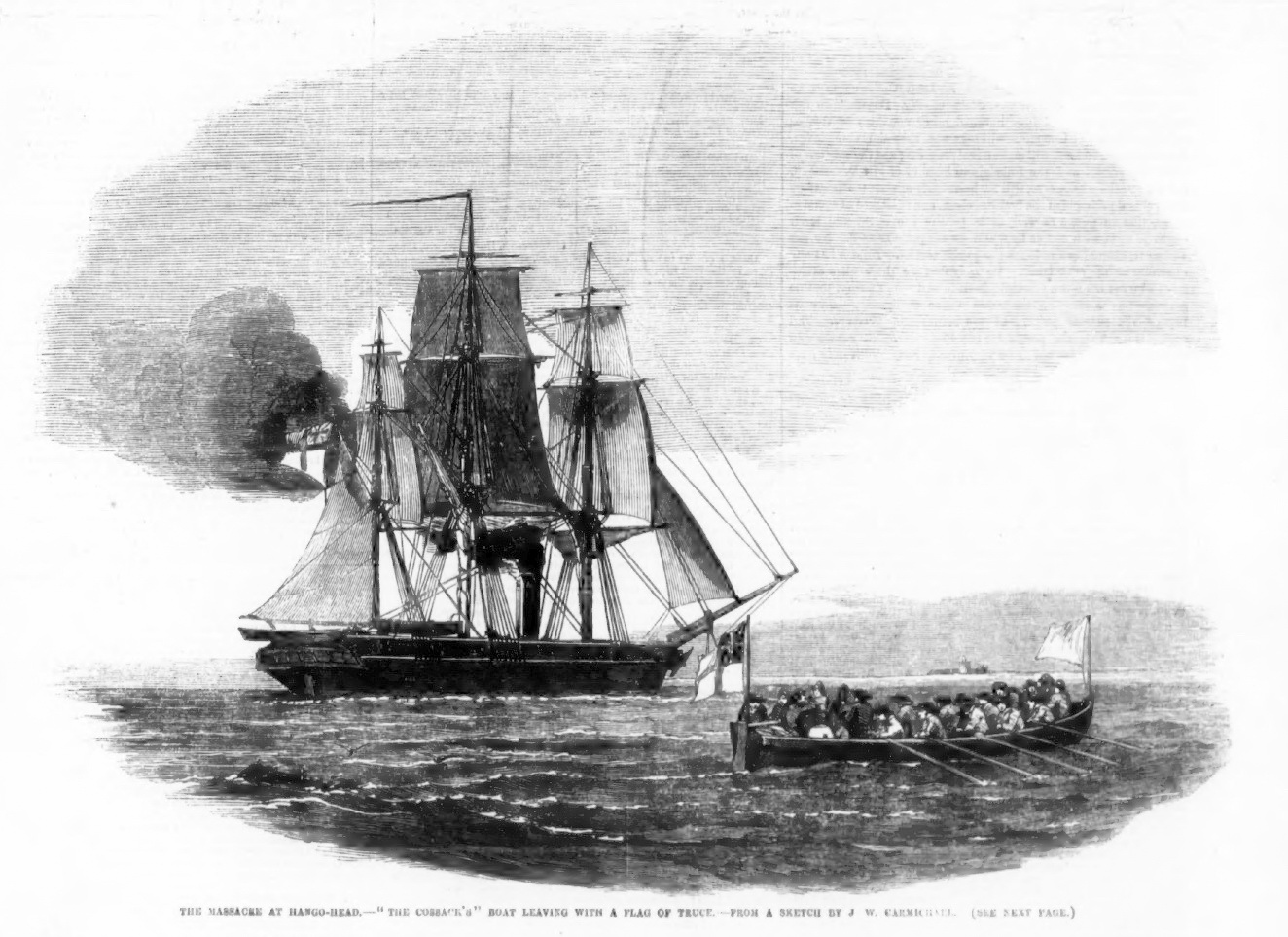 Резня в Ханко, лодка с «Cossack» отплыла с белым флагом. По эскизу Д. У. Кармайкла. «Лондонские иллюстрированные новости». 23 июня 1855 г.