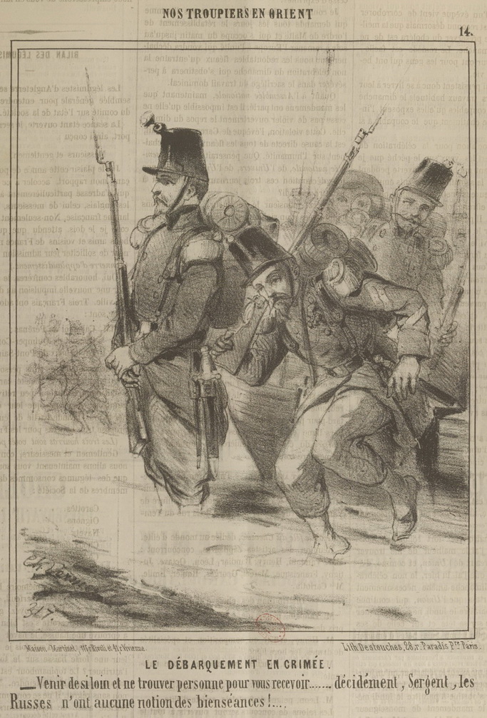 Карикатуры были подобного свойства и чаще всего высмеивали неудачи русской армии. Скажем, русские солдаты изображались с головами, повернутыми назад, и эта особенность объяснялась привычкой, выработанной в ходе отступления из Дунайских княжеств (27 сентября 1854 г.). Или захваченный у России остров Бомарзунд изображался в виде пера, потерянного двуглавым орлом (27 сентября 1854 г.). Крымские события также дали повод для ряда подобных карикатур. Одна из них (от 29 сентября 1854 г.) высмеивала неспособность русских войск воспрепятствовать неприятельскому десанту в Крыму. В подписи к иллюстрации приводился вымышленный диалог французских солдат, будто бы раздосадованных тем, что их никто не встречает на берегу полуострова.