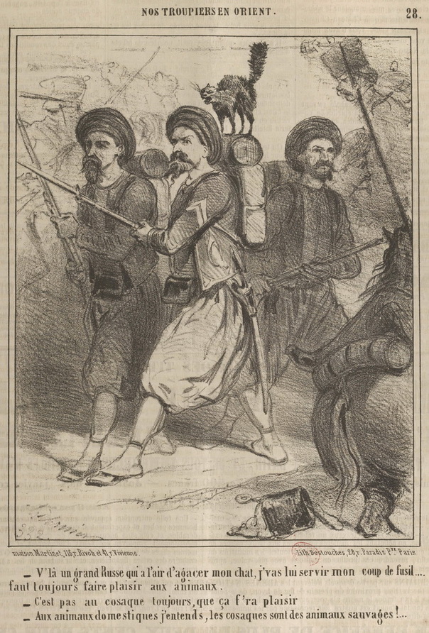 Видимо, карикатуры на русскую тему пользовались у публики популярностью. Были карикатуристы, выбравшие эту тему в качестве основной для себя. Среди таких наибольшей известностью пользовался Оноре Домье, создавший для редакции «Шаривари» в 1854–1856 гг. около 90 сатирических иллюстраций по событиям Крымской войны [4, с. 80]. Причем редакция «Шаривари» не ограничивалась газетным форматом и публиковала целые альбомы карикатур на русских. О содержании этих изданий можно судить по их заглавиям: «Шаржи на русских. Альбом из сорока карикатур» [37] или «Казаки для смеха» [46]. Чудовищные образы казаков в этих карикатурах были отзвуком страхов, испытанных французами перед вступлением русских войск во Францию еще в эпоху Наполеона I [50, с. 36].