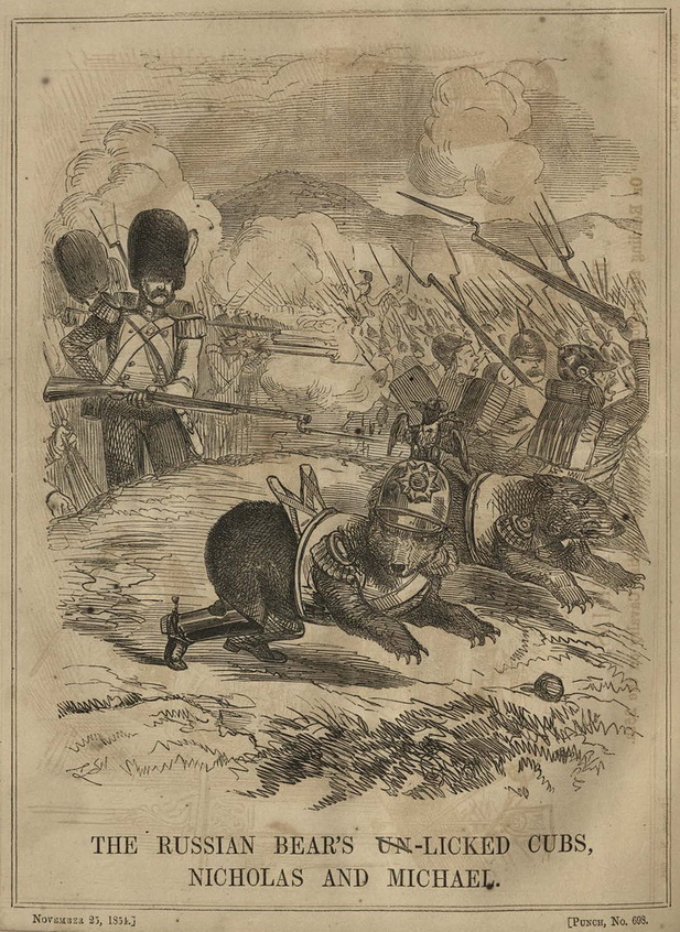 Карикатуры «Панча» отзывались на все значительные события Крымской кампании и предсказуемо обыгрывали уничижительные национальные метафоры [22, с. 265]. Скажем, на иллюстрации, изображающей Инкерманскую битву, британские солдаты гонят штыками отступающих русских солдат и двух медвежат, под «обликом» которых художник подразумевал царевичей Николая и Михаила. Как известно, великие князья присутствовали при этом сражении.