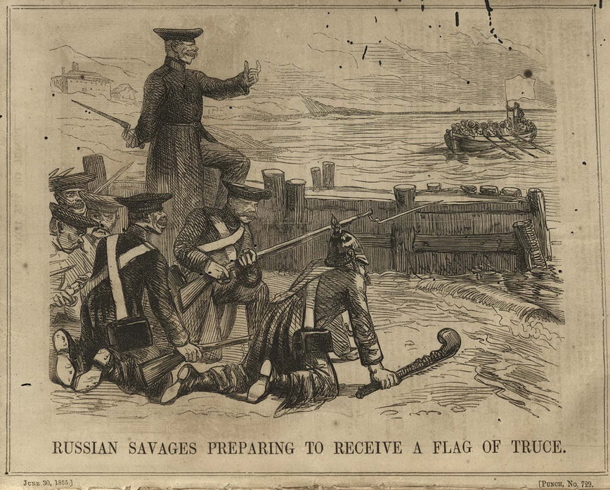 Русские дикари готовятся встретить белый флаг. «Панч». 30 июня 1855 г.