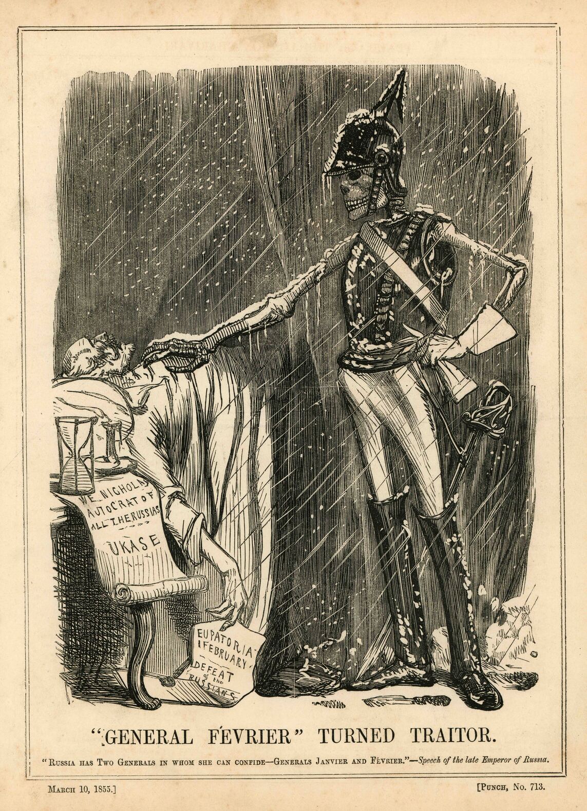Предсказуемо, что на смерть Николая I «Панч» также отреагировал не без злой иронии. Журнал разместил карикатуру, изображавшую умершего самодержца. Иллюстрацию сопровождала подпись «Генерал Февраль оказался предателем», отсылавшая к высказыванию Николая I «У России есть два генерала, которым можно доверять, – Январь и Февраль».