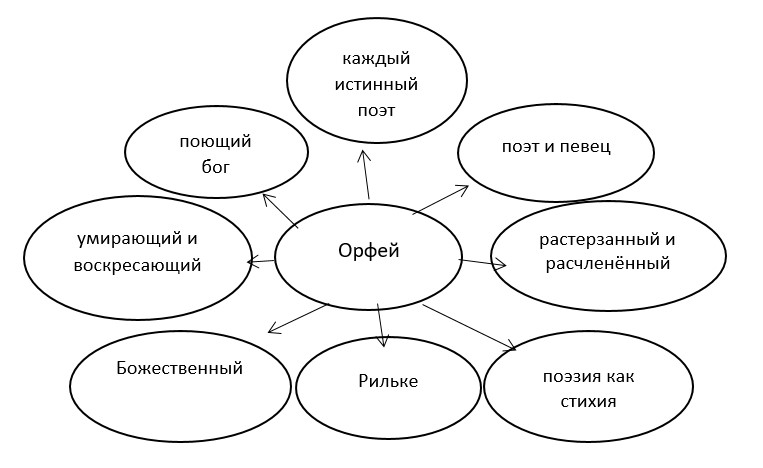 В трактовании образа Орфея Цветаева отступает от общепринятого набора характеристических определений за счет расширения семантической и символической емкости мифонима как вербального символа: в семантический комплекс Орфей входят новые компоненты, что схематично представлено на рисунке 1. Под вербальными символами, вслед за Карауловым, понимаются «слова, несущие какой-то очень глубокий, поддающийся масштабному, практически неограниченному развёртыванию, смысл» [14, с. 203]. В результате анализа получаем представленные ниже составляющие семантического комплекса.